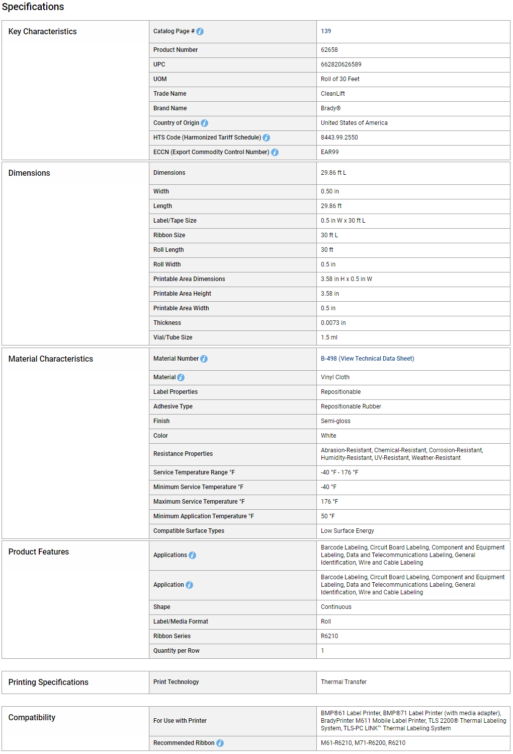 Product Highlights Label/Tape Size: 0.5 in W x 30 ft L Material Type: Vinyl Material Number: B-498 (View Technical Data Sheet) Color: White Label Properties: Repositionable For Use with Printer: BMP®61 Label Printer BMP®71 Label Printer (wit
