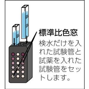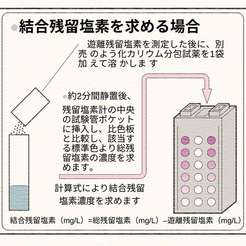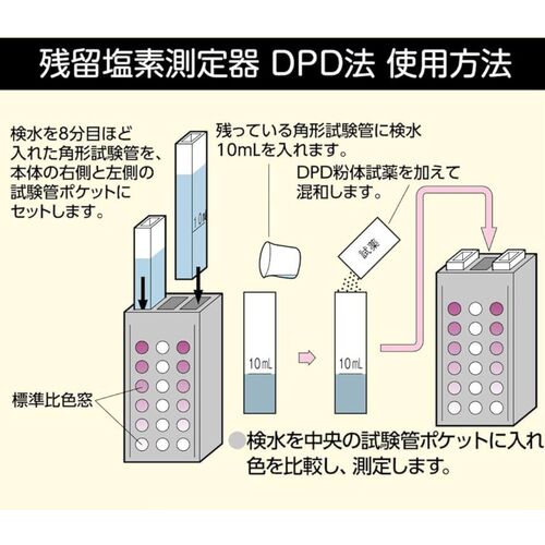 - โดยการใช้สารละลายโพแทสเซียมไอโอไดด์ (จำหน่ายแยกต่างหาก) จะสามารถแยกแยะความแตกต่างระหว่างคลอรีนตกค้างอิสระและคลอรีนตกค้างที่รวมตัวกับสารอื่นได้อย่างชัดเจน